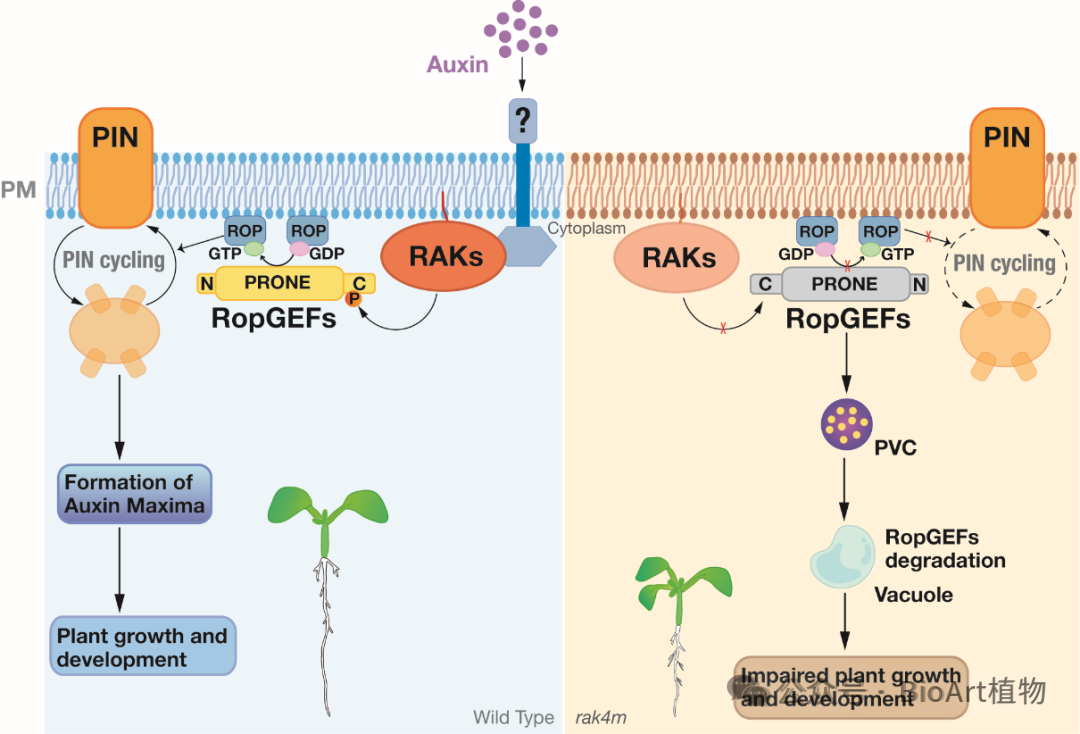 综上所述,该研究鉴定了RAK-RopGEF 这一关键功能模块,揭示了蛋白磷酸化在生长素活化ROP的细胞表面信号通路中重要性,阐明了RAKs通过磷酸化精确调控RopGEF1的活性、亚细胞定位和蛋白稳定性,进而激活ROP的分子机制,为理解生长素如何精细调控细胞极性和植物的器官发生提供了重要理论依据。