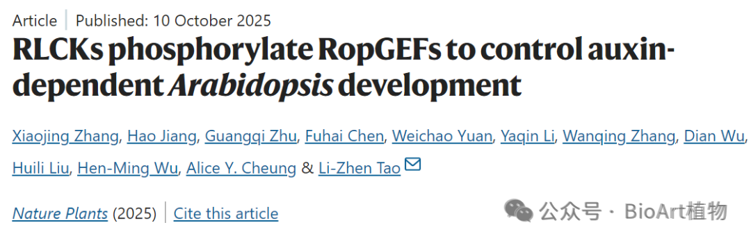 近日,华南农业大学陶利珍团队在Nature Plants杂志在线发表题为RLCKs phosphorylate RopGEFs to control auxin-dependent Arabidopsis development的研究论文,揭示了胞质类受体激酶RAKs通过磷酸化精准调控RopGEF1的活性和稳定性,进而激活ROP分子开关和控制生长素依赖的发育机制。RLCK-RopGEF功能模块的鉴定,填补了生长素与ROP之间的细胞表面信号通路中缺失的关键节点。
