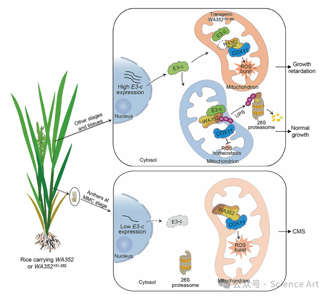 最近,科学家们以水稻为研究对象,揭开了这个秘密。他们发现,导致“野栽型不育”的蛋白WA352,其实在植物的营养组织(如叶片)中会被一套名为“泛素-蛋白酶体系统”的细胞机器降解掉,就像被贴上了“回收标签”一样。这套降解系统的关键执行者是几种定位在线粒体中的F-box蛋白,它们能够识别WA352蛋白的N端结构,并引导其被降解。然而,在花药发育的关键时期——当花粉母细胞开始形成时,编码这些F-box蛋白的基因活性会特异性降低。这就好比“回收工人”集体放假了。于是,WA352蛋白便得以在花药的线粒体中大量积累。积累下来的WA352蛋白会“劫持”一个名为COX11的正常线粒体蛋白,干扰其功能,最终导致细胞内活性氧爆发,引发细胞程序性死亡,从而造成雄性不育。这项研究揭示了一个精巧的调控机制:通过在其他组织里主动降解,只在花药发育的特定时间窗口关闭降解系统,从而实现了WA352蛋白的“靶向积累”。这完美解释了为什么一个在全株都表达的基因,却能精准地只影响花的雄性育性,为杂交育种技术的进一步发展提供了重要的理论依据。
